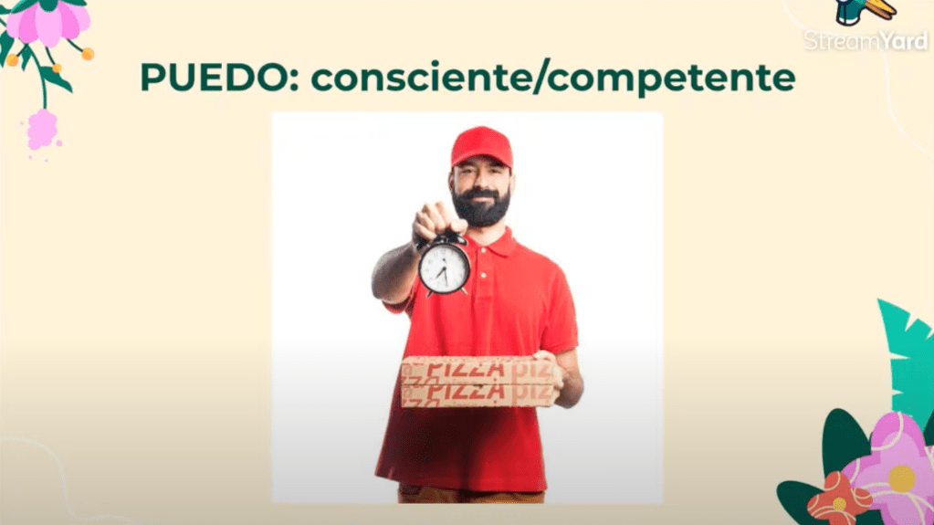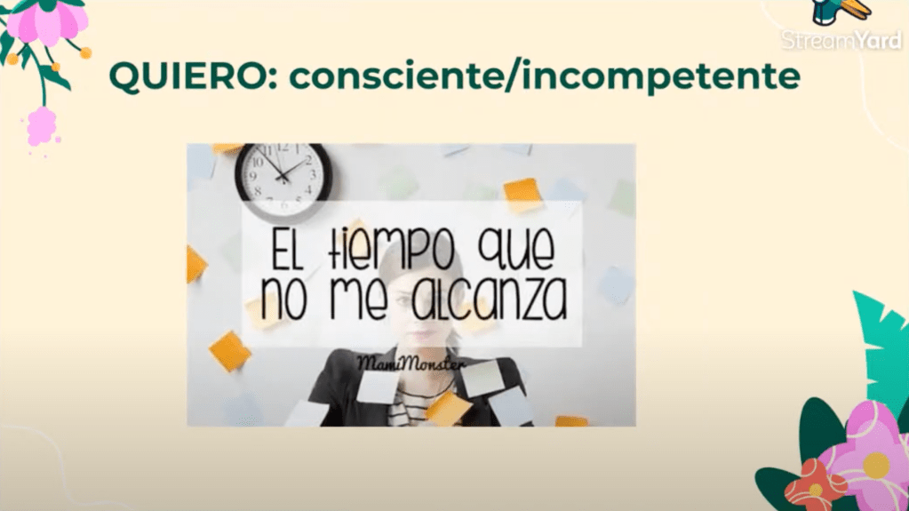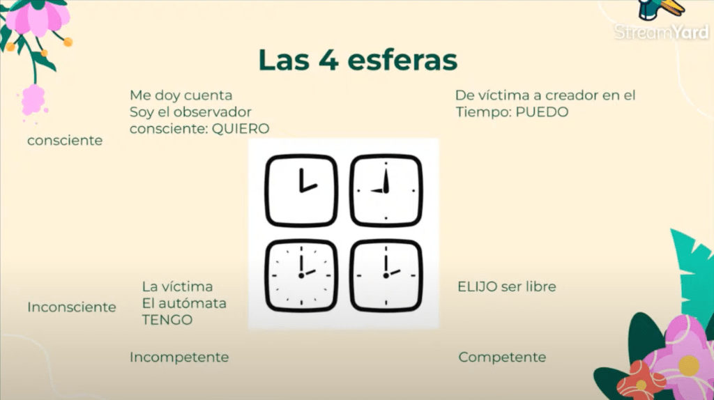 En ese aspecto del consciente competente que es el puedo, que es el cuando pasamos de esa víctima a cuando decimos no es que a mí como nunca me alcanza el tiempo, de alguna forma cuando pasamos de ese de esa parte consciente competente es cuando nosotros nos hacemos cargo de porque de alguna forma hemos sido como Ay no es que como a mí nunca me alcanza el tiempo o como yo no no es que yo no puedo con esto y realmente es cuando yo digo “yo sí puedo” entonces los aspectos son el tengo, tengo que porque como a mí me toca y porque como nací así, nací tarde llego tarde podría ser una una una cosa de decir quiero, quiero hacer un cambio definitivamente, quiero hacerlo, el puedo, puedo hacerlo.