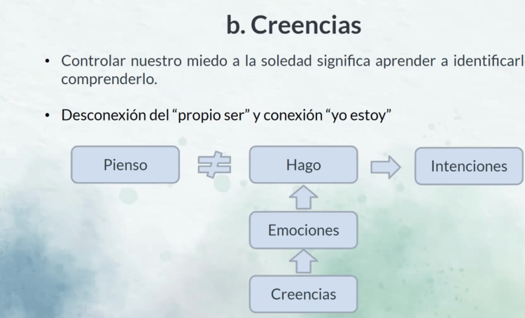 Las creencias da para mucho que lo he pasado e da para mucho eh Y simplemente vamos a hacer una pincelada vale sería controlar nuestro miedo a la soledad significa aprender a identificar, porque vuelvo a insistir en esta parte del inicio que lo que solemos hacer esa sensación de aplaste, aquí me pasa algo… Pero lo que hago es como: «aquí no pasa nada todo está bien y es perfecto». Así que lo que solemos hacer es desconectarnos de nuestro propio ser y del yo estoy o sea lo que hago es que me desconecto mucho, entre lo que pienso hago y esas intenciones o sea lo que hago, lo que expreso y debajo del hago siempre hay unas emociones y unas creencias que deben de estar conectadas con lo que yo necesito con mi propio ser con el Yo estoy con el no como y todo eso que esté conectado con una verdadera presencia en creencias Hay un montón y sobre la soledad infinitas algunas de las que hemos añadido que son como yo siempre digo que es el bucle permanente no sería como una espiral que no para no para es todo el rato como un sin parar:n»o conseguiré ser feliz con nadie más» cuando hay una pérdida de pareja o cuando hay una pérdida en una relación familiar en una relación de amistad no podré ser feliz cada vez es más complicado…