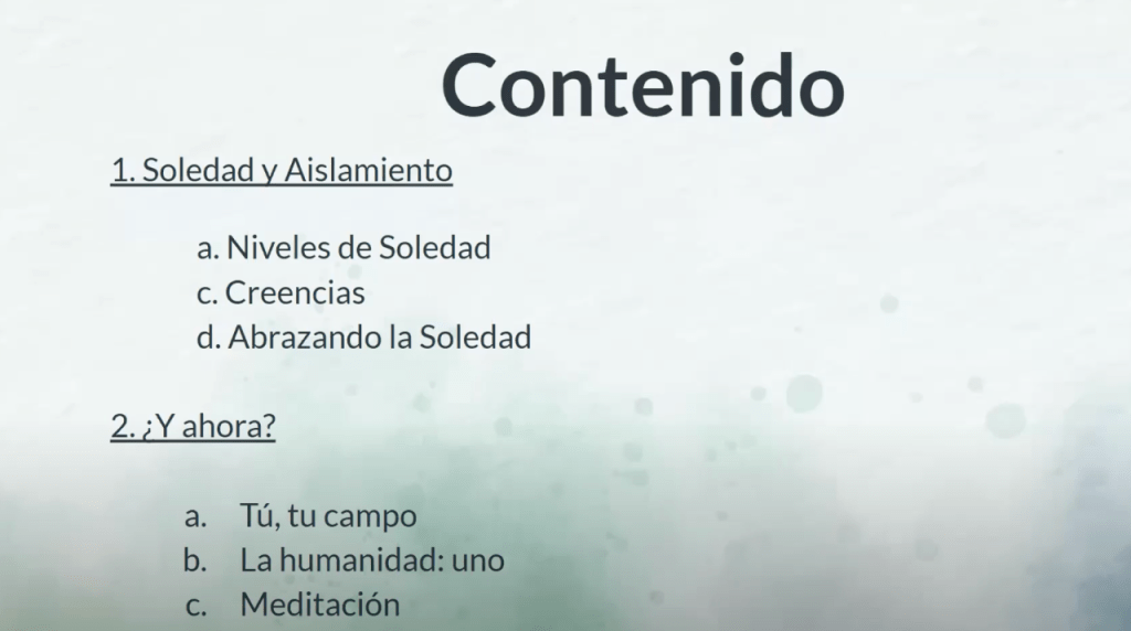 Vamos a hacer un recorrido de algunas cosas que consideramos que son importantes el contenido. La charla de hoy va con dos partes vale la primera sería hablar sobre la soledad, el aislamiento, esa sensación de aislarme conmigo mismo o lo que ocurre en mi familia, hay niveles de Soledad, creencias abrazar la soledad y luego trabajaremos con ¿Y ahora qué hago? ¿Qué hago con esto? Pues bueno trabajaremos un poco con eso con varias herramientas