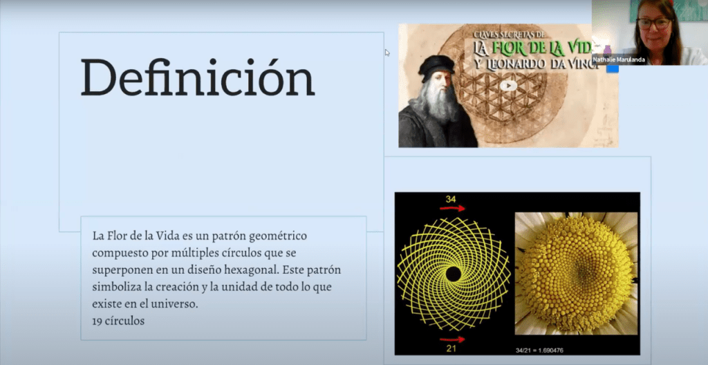 Entonces vamos a ver como la flor es no solamente lo que nosotros vemos como la flor sino es más allá de eso de lo que es visible es una representación no lineal del tiempo y del espacio Y eh la flor nos fomenta nos nos va a ayudar en encontrar ese ese esa tranquilidad esa armonía esa paz. Hoy justamente conversaba con una paciente que hablábamos sobre y qué sería el ideal la felicidad o la tranquilidad me decía, fue muy bonito lo que ella me compartía y lo comparto acá porque me encantó que uno diría «No pues a lo mejor la felicidad o o es la tranquilidad.» Y y ella me decía «Es que tal vez en la tranquilidad podemos tener la las posibilidades de manifestar todas las emociones no solamente la felicidad sino tener como la posibilidad de manifestación global.» Entonces me pareció muy bonito su frase y la traigo acá en estos momentos porque justamente la flor de la vida nos ayuda a fomentar esos espacios de armonía y paz y nos van a ayudar mucho en nuestros espacios físicos no solamente a nivel corporal no solamente si la la empleamos en alguien a nivel terapéutico sino también generando y creando espacios de armonía.