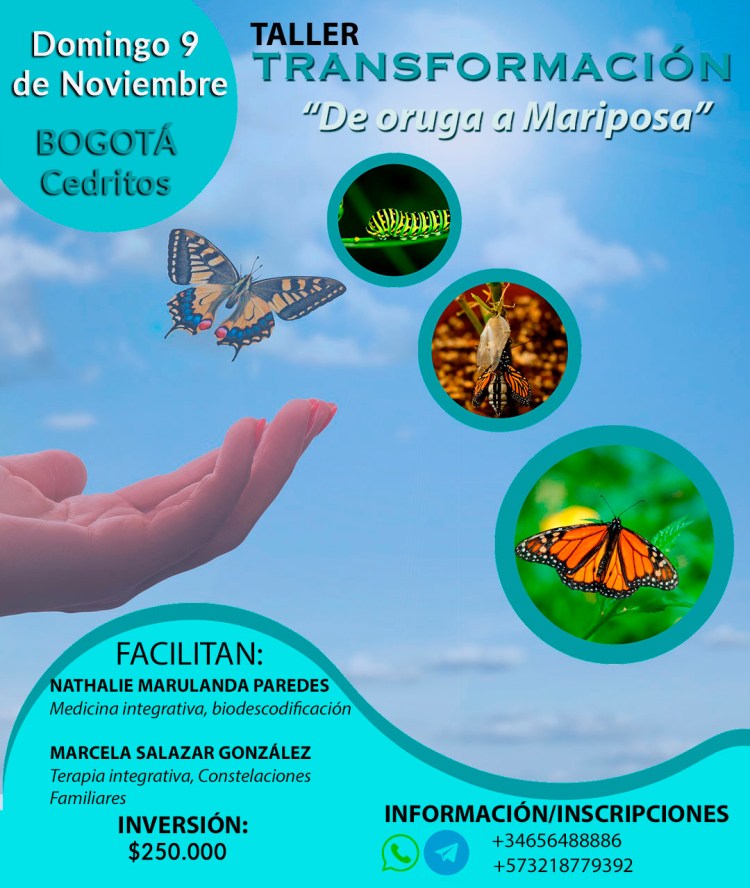 Es por ello que nos hemos propuesto el objetivo de compartir nuestros aprendizajes con Nathalie Marulanda , en este nuevo camino de Transformación personal que llamamos “De oruga a Mariposa”, un taller donde integramos la visión de la Biodescodificación y las Constelaciones Familiares.