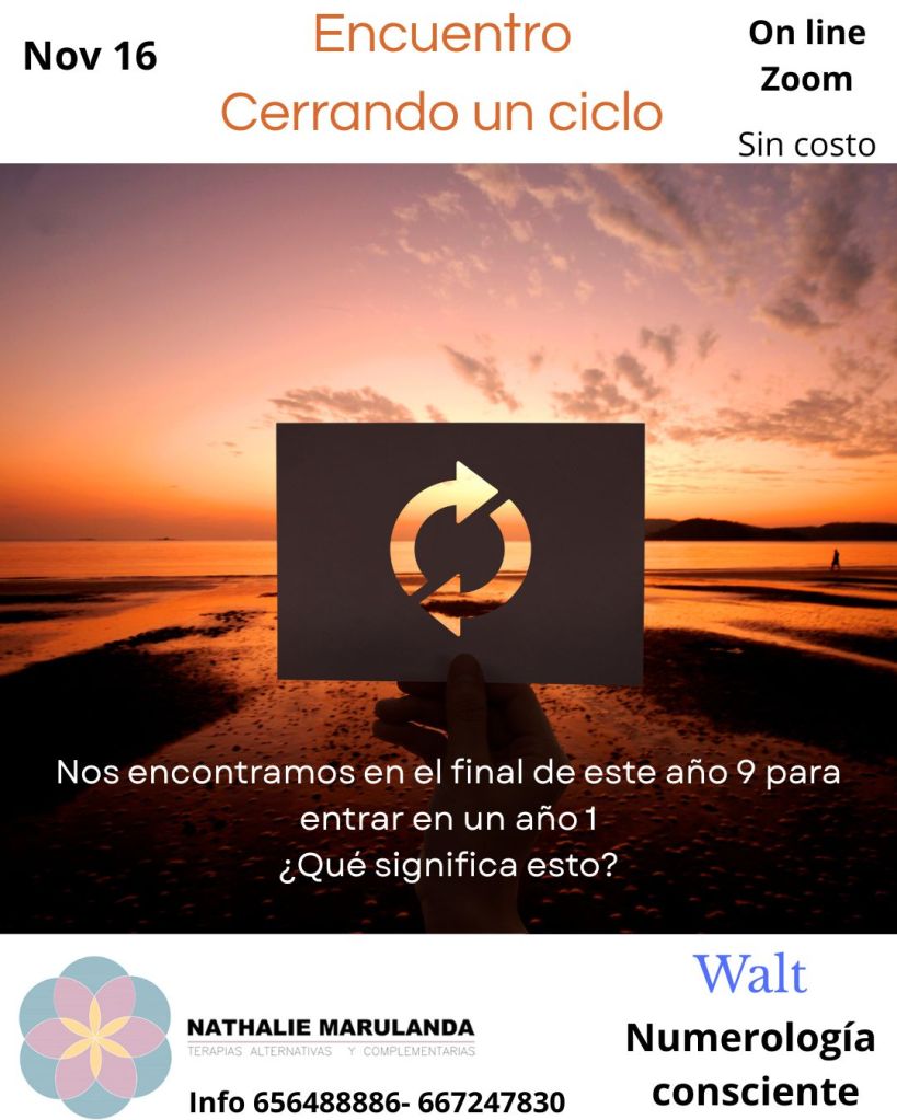 Hola esta es una invitación para participar en un encuentro donde hablaremos del significado de este cierre de ciclo del año 2025, año 9 para pasar al año 2026, año 1. La numerología es un lenguaje que te ayuda a comprender tu ser en el ritmo de la vida.